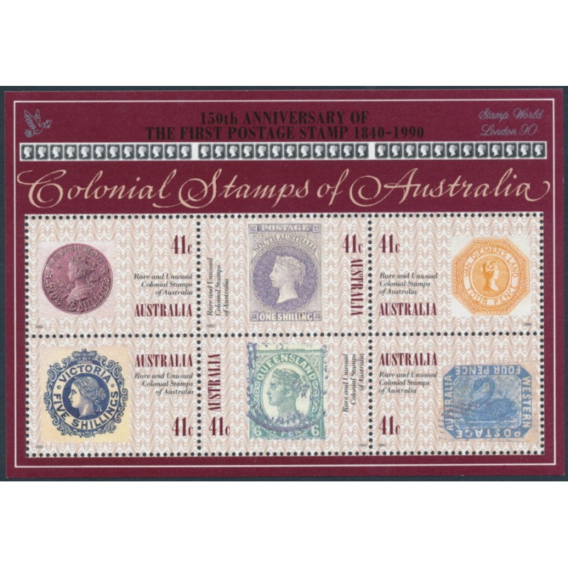 AUSTRALIA 1990 Colonial Stamps/Anniversary of the Penny Black M/S, overprinted London ‘90, mint never hinged – no thins, tears or bends. SG Cat. # MS1253