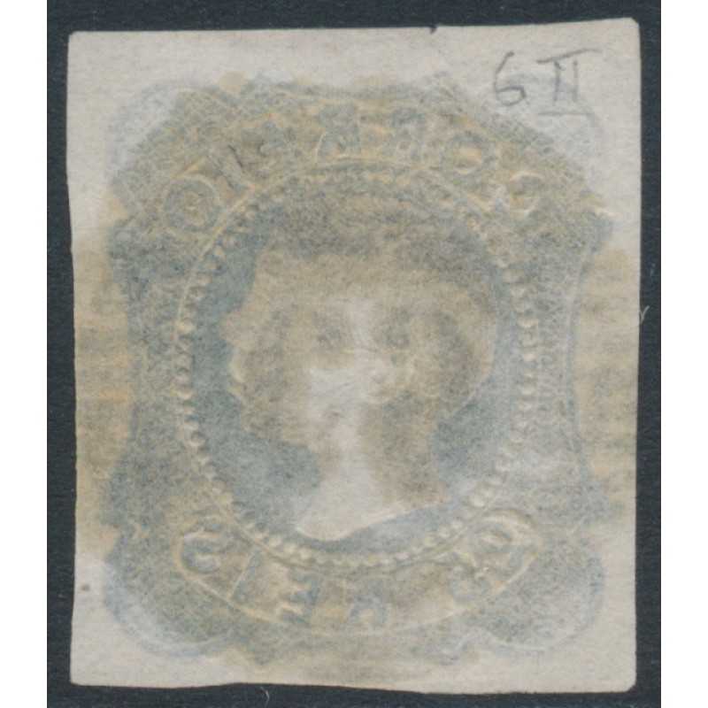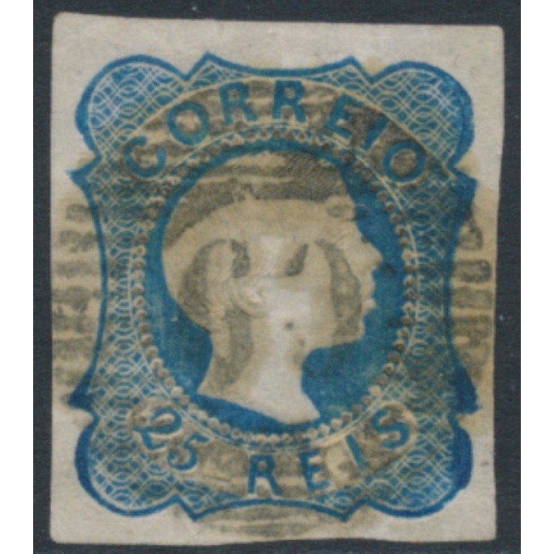 1855 25R blue King Pedro V (straight hair, pearls touch outer frame, smaller numerals), imperforate, used – no thins, tears or bends.