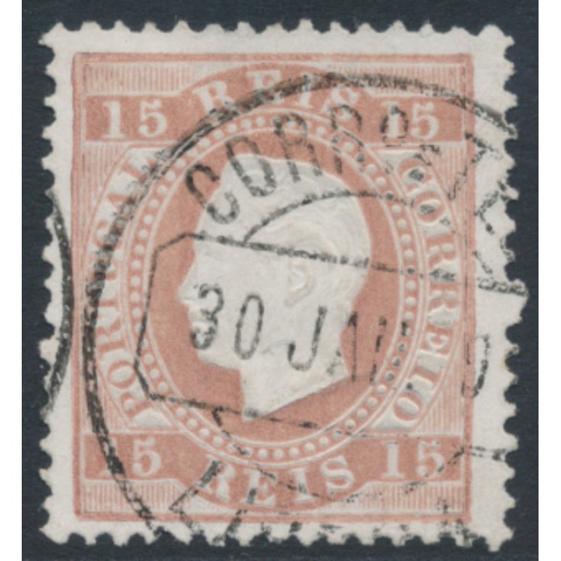 1875 15R brown King Luis I, straight value ribbon, perf. 12½:12½, on ordinary paper, used – no thins, tears or bends.