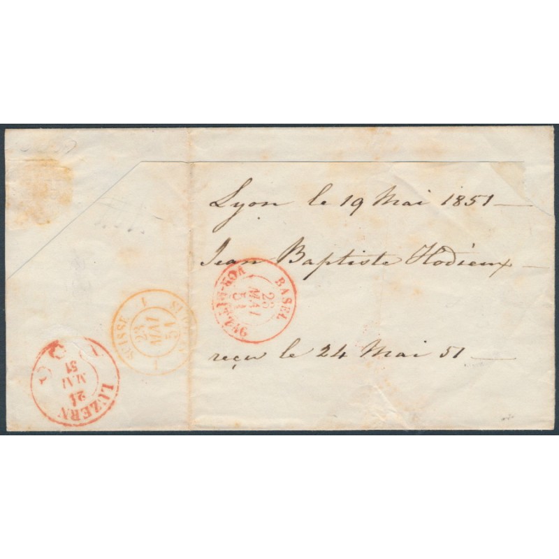 1851 40c orange Cérès (neck shading is dots), imperforate, used – on folded outer from Lyon 24 V 1851 to Lucerne, Switzerland, the stamp and the cover are sound.