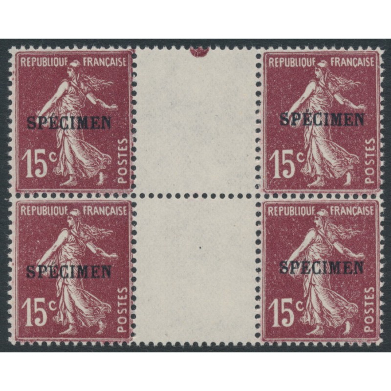 1926 15c purple-brown Semeuse in a gutter block of 4, overprinted SPECIMEN (cours d'instruction), mint never hinged – no thins, tears or bends.