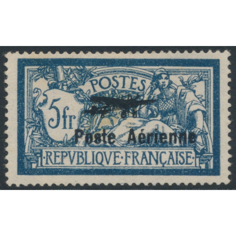 FRANCE 1927 5Fr blue/buff Merson, overprinted Poste Aérienne, mint hinged – no thins, tears or bends. Has been expertised as genuine by Brun. Michel Cat. # 221 Yvert Cat. # PA2