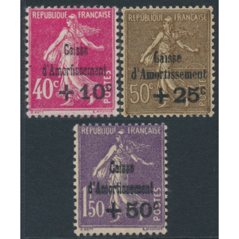 FRANCE 1930 Caisse d’Amortissement overprints set of 3, mint hinged – no thins, tears or bends. Michel Cat. # 252-254 Yvert Cat. # 266-268