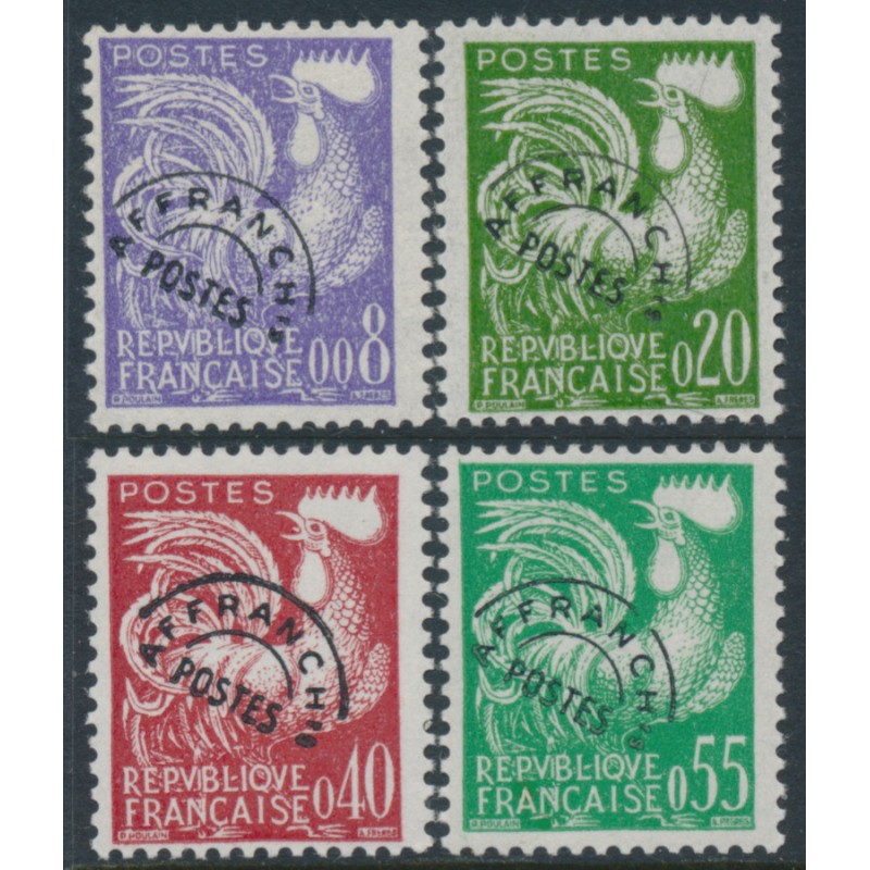 FRANCE 1960 0.08Fr to 0.55Fr Gallic Rooster pre-cancels (pré-oblitérés) set of 4, mint never hinged – no thins, tears or bends. Michel Cat. # 1302-1305 Yvert Cat. # PO119-PO122