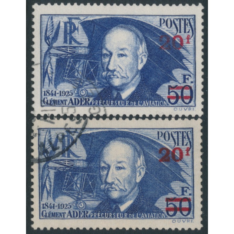 FRANCE 1940 20Fr on 50Fr blue Clément Ader, on thin & thick papers, used – no thins, tears or bends. Michel Cat. # 495a + 495b Yvert Cat. # 493 + 493a