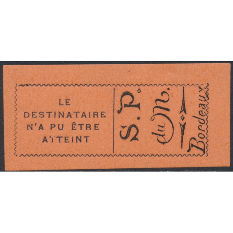 FRANCE 1916 Return to Sender label, black on red (timbre de retour), mint never hinged – no thins, tears or bends. Yvert Cat. # TR2