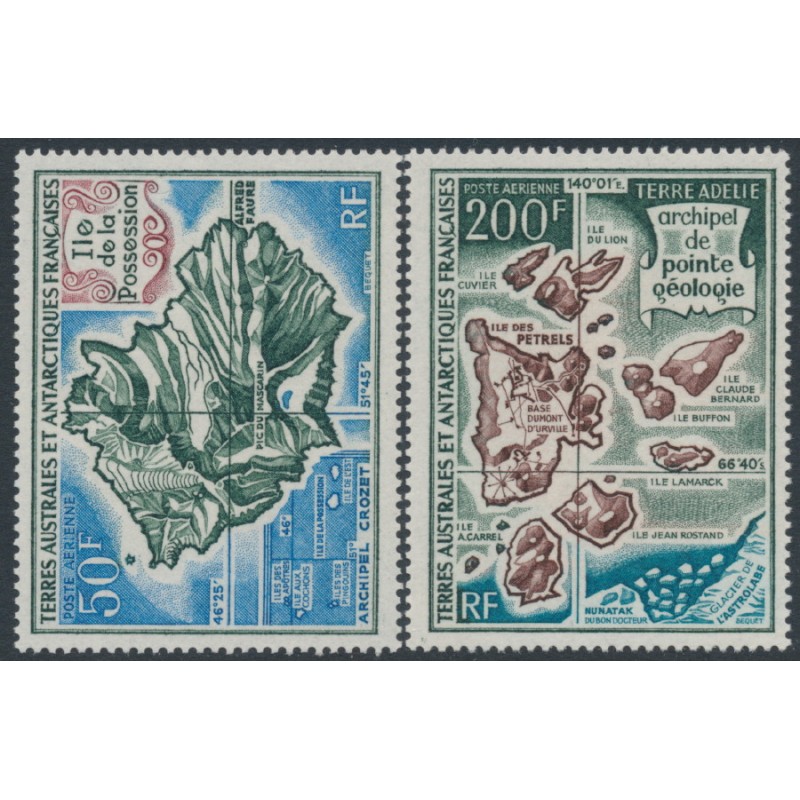 FRANCE / T.A.A.F. 1971 50Fr Îles Crozet & 200Fr Terre Adélie set of 2, mint never hinged – no thins, tears or bends. Michel Cat. # 58-59 Yvert Cat. # PA23-PA24