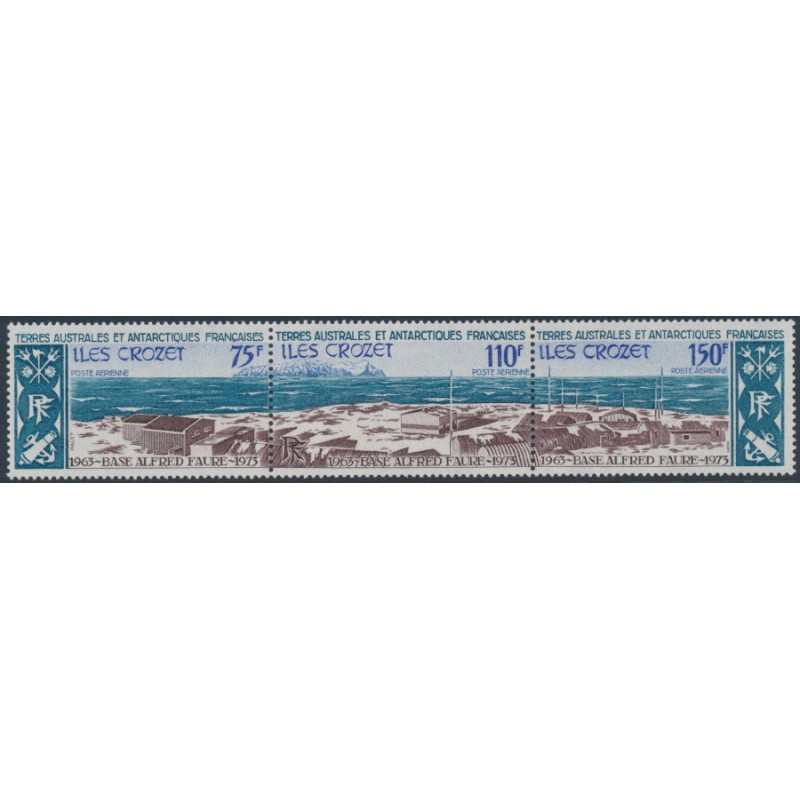 FRANCE / T.A.A.F. 1974 75Fr & 150Fr Îles Crozet strip of 3, mint never hinged – no thins, tears or bends. Michel Cat. # 89-91 Yvert Cat. # PA36A