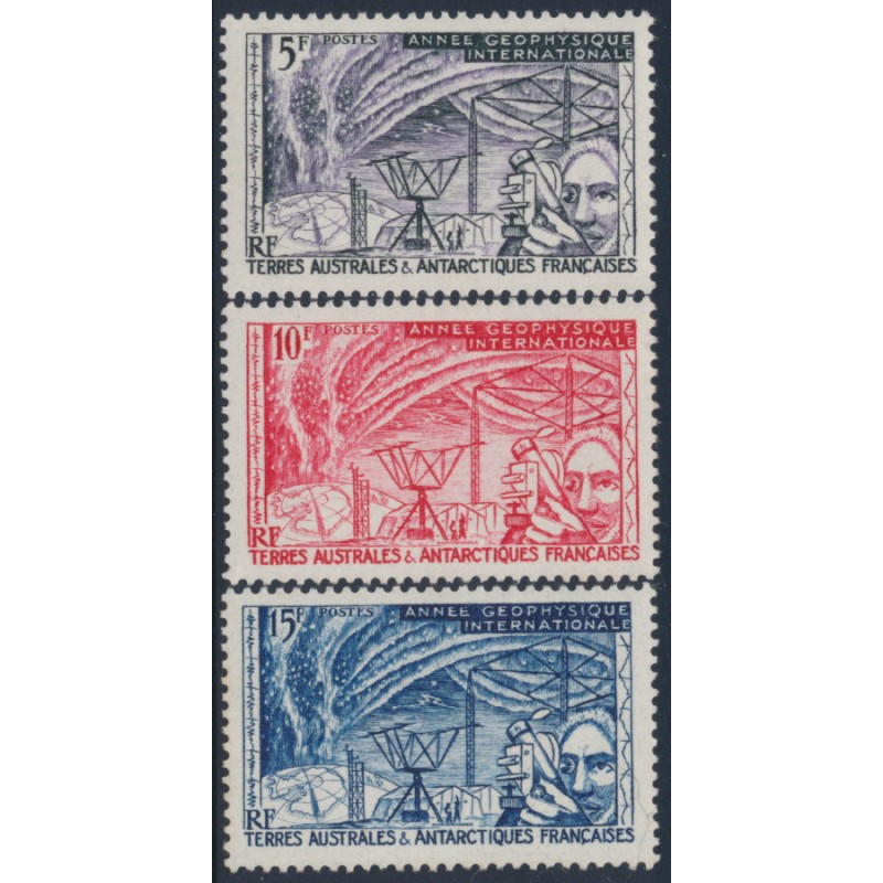 FRANCE / T.A.A.F. 1957 5Fr to 15Fr Geophysical Year set of 3, mint never hinged – no thins, tears or bends. Michel Cat. # 10-12 Yvert Cat. # 8-10