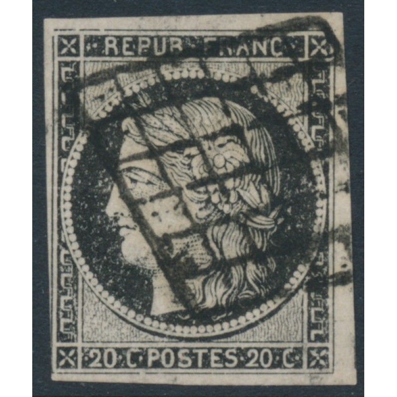 FRANCE 1849 20c black Cérès on white paper (neck shading is dots), imperforate, used – no thins, tears or bends. Michel Cat. # 3x Yvert Cat. # 3a
