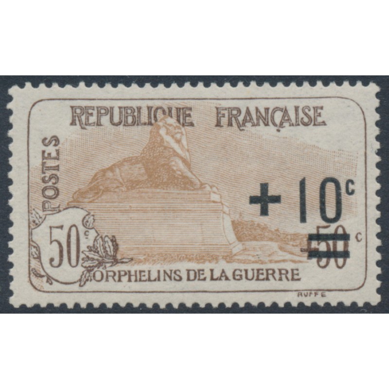 FRANCE 1922 50c+10c overprint on 50c+50c brown/yellow-brown War Orphans, mint hinged – no thins, tears or bends. Michel Cat. # 149 Yvert Cat. # 167