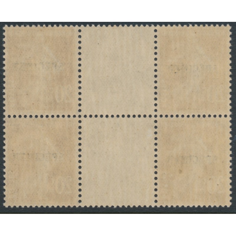 1907 20c purple-brown Semeuse in a gutter block of 4, overprinted SPECIMEN (cours d'instruction), mint never hinged – no thins, tears or bends.