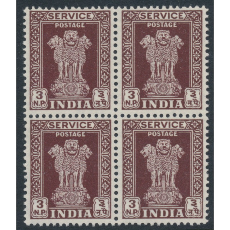 INDIA 1958 3np chocolate Official, with inverted Asokan Capital watermark, block of 4, mint never hinged – no thins, tears or bends. SG Cat. # O177w