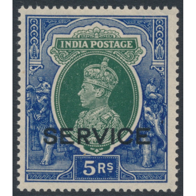 INDIA 1939 5Rp green/blue King George VI Official, overprinted SERVICE, upright multiple stars watermark, mint hinged – no thins, tears or bends. SG Cat. # O137