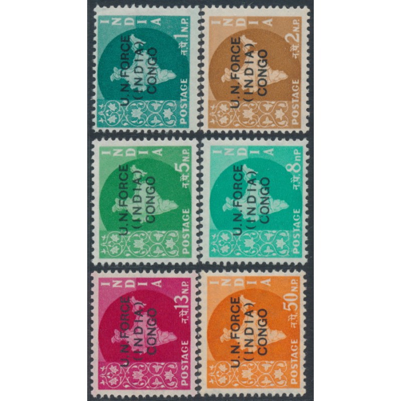 1962 1np to 50np Map of India overprinted U.N. FORCE (INDIA) CONGO, mint never hinged – no thins, tears or bends.