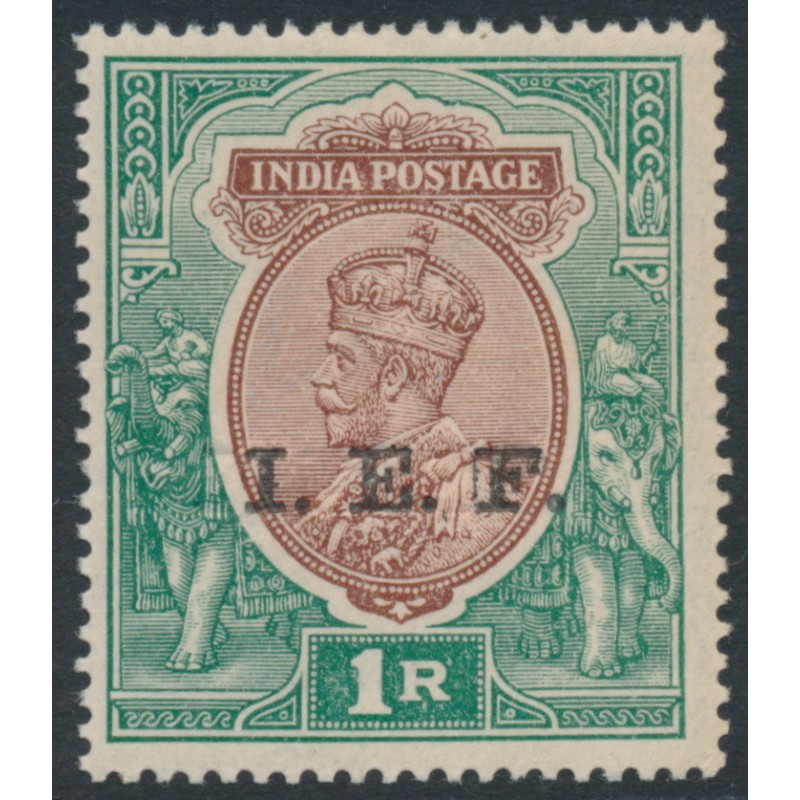 INDIA 1914 1Rp brown/green King George V with a double I.E.F. (Indian Expeditionary Forces) overprint (one albino) variety, mint hinged – no thins, tears or bends. SG Cat. # E13a