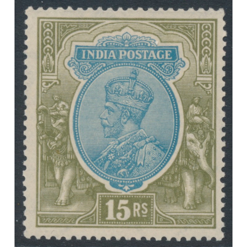 INDIA 1928 15R blue/olive King George V definitive, upright multi star watermark, mint never hinged – no thins, tears or bends. SG Cat. # 218