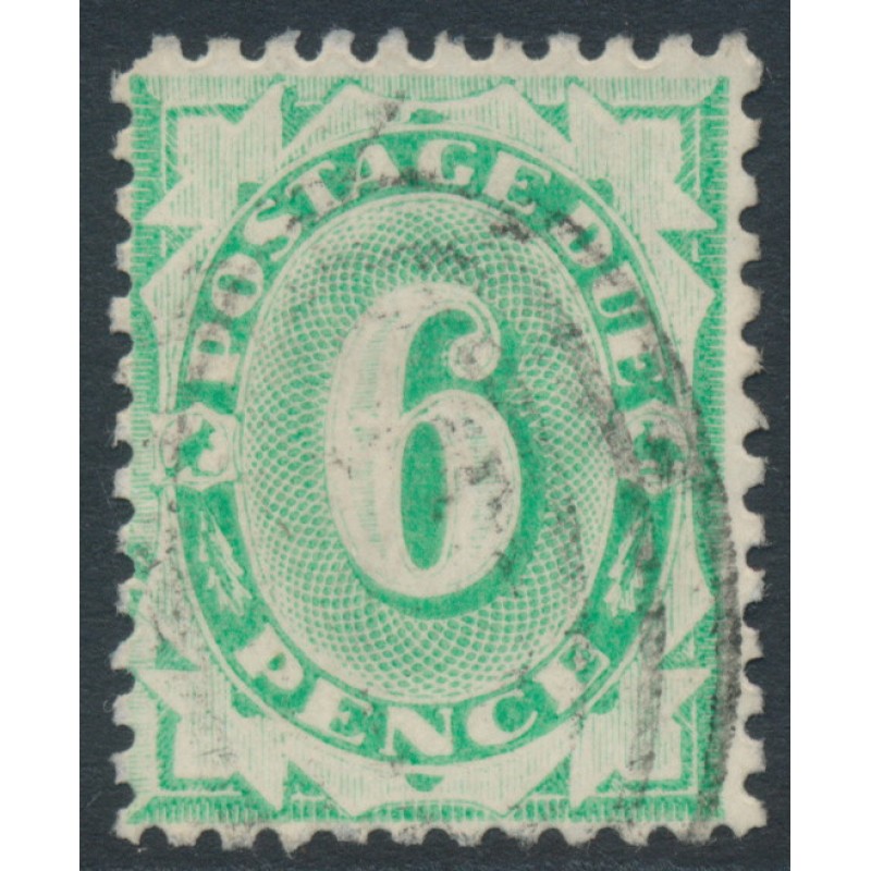 1904 6d emerald Postage Due, filled in base, perf. 11:11, inverted crown NSW watermark, used – no thins, tears or bends.