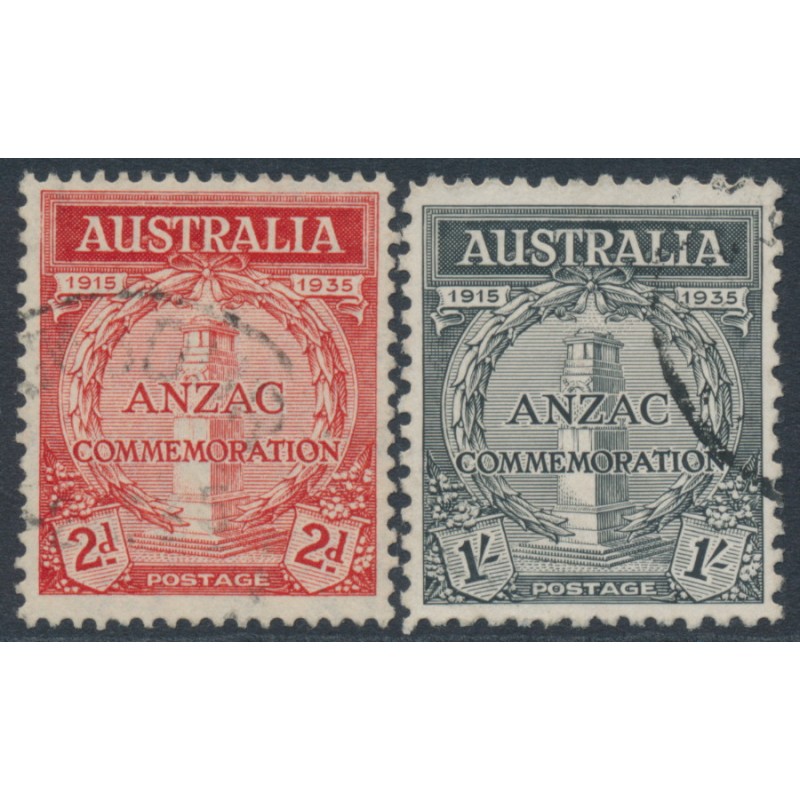 AUSTRALIA 1935 2d red and 1/- black ANZAC Anniversary set of 2, used – no thins, tears or bends. SG Cat. # 154-155 BW(ACSC) Cat. # 164-165