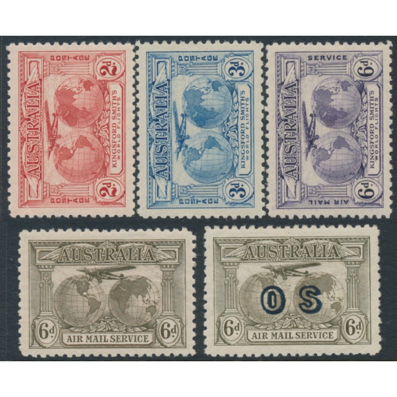 1931 2d to 6d Kingsford Smith Airmail set of 5 (includes both 6d shades and the 6d brown overprinted OS), mint hinged – no thins, tears or bends.