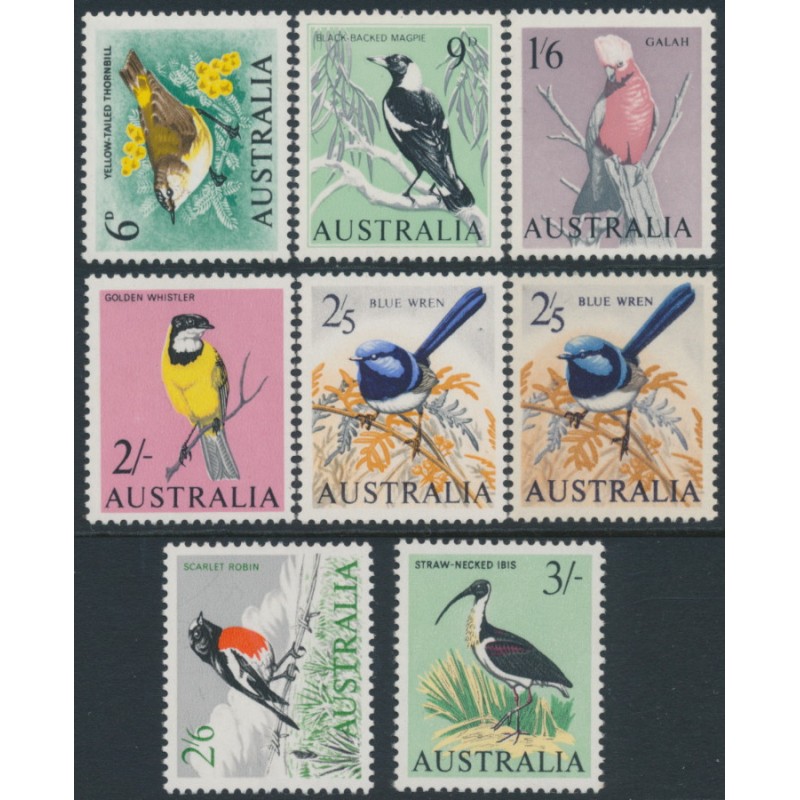 AUSTRALIA - 1964-1965 6d to 3/- Native Birds set of 8, MNH – SG # 363-369 + 367a