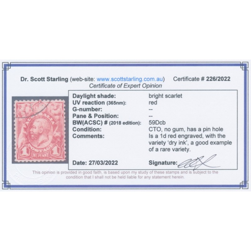 AUSTRALIA 1913 1d bright scarlet engraved KGV Head, with the variety ‘dry ink’, used – has a pin hole, otherwise sound. Has a Starling certificate. BW(ACSC) Cat. # 59Dcb