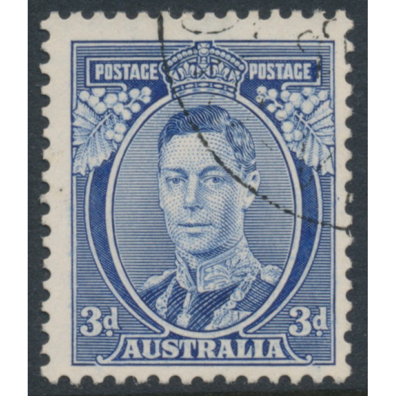 AUSTRALIA - 1937 3d blue KGVI definitive, die I (TA joined), perf. 13½:14, CTO – SG # 168