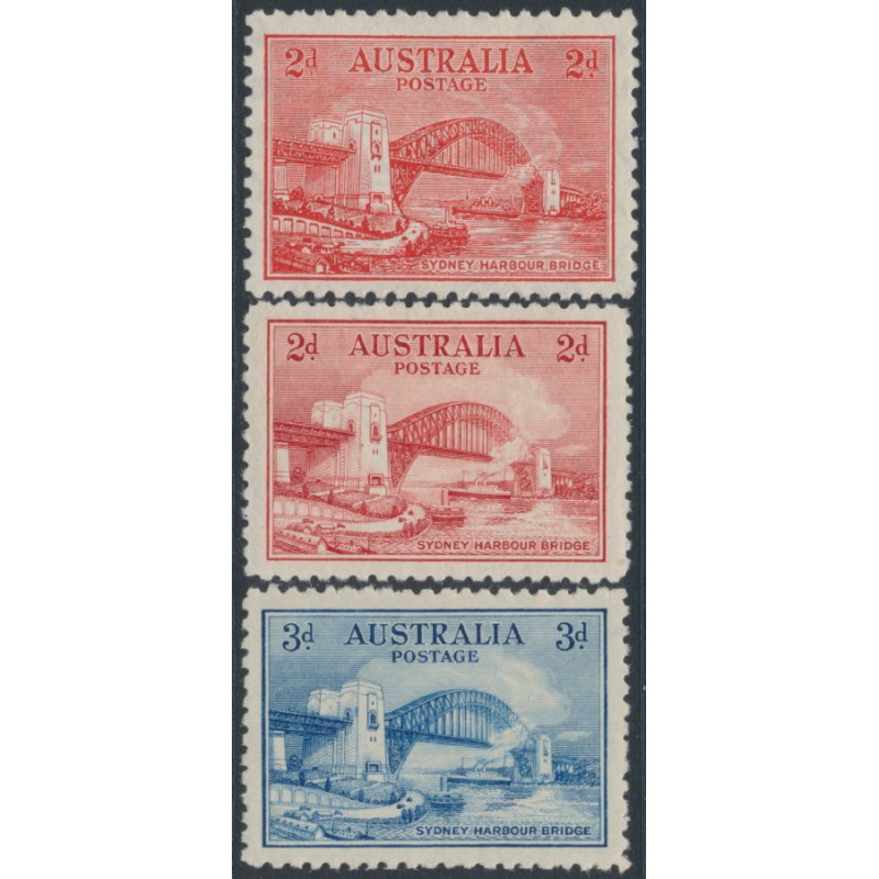 AUSTRALIA 1932 2d red & 3d blue Sydney Harbour Bridge set of 3, mint hinged – no thins, tears or bends. BW(ACSC) Cat. # 146, 147, 149 SG Cat. # 141, 142, 144
