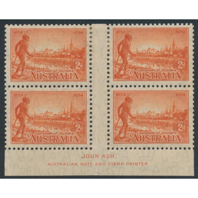 AUSTRALIA 1934 2d red Centenary of Victoria, perf. 10½, Ash Imprint block of 4, mint hinged – no thins, tears or bends. BW(ACSC) Cat. # 151Az