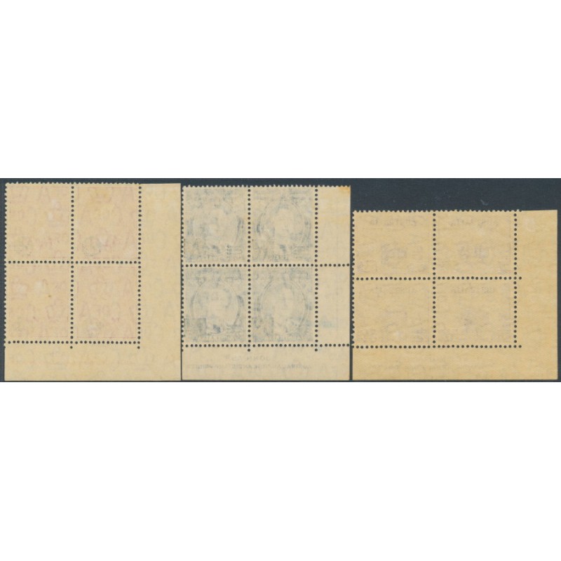 AUSTRALIA 1941 2½d to 5½d surcharges set of 3, Ash Imprint blocks of 4, mint hinged – no thins, tears or bends. BW(ACSC) Cat. # 222z + 223zb + 224z