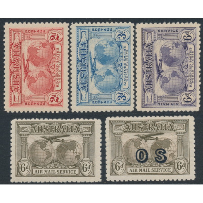 1931 2d to 6d Kingsford Smith Airmail set of 5 (includes both 6d shades and the 6d brown overprinted OS), mint never hinged – no thins, tears or bends.
