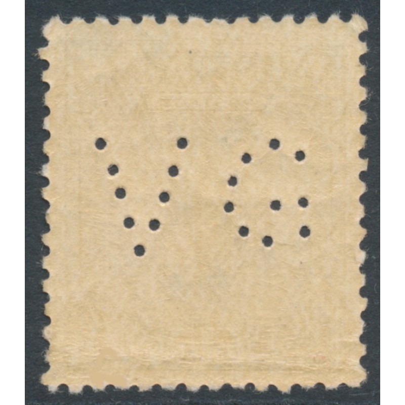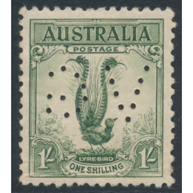 AUSTRALIA 1932 1/- green Lyrebird, reversed VG perfin, mint never hinged – no thins, tears or bends. BW(ACSC) Cat. # 145A SG Cat. # 140