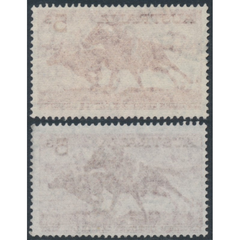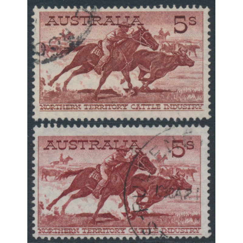 AUSTRALIA 1961-1964 5/- red-brown Cattle on cream paper & 5/- brown-red Cattle on white paper, used – no thins, tears or bends. BW(ACSC) Cat. # 373A + 373C SG Cat. # 327 + 327a