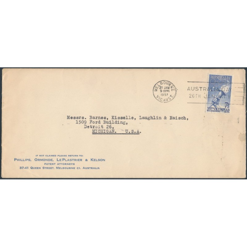1957 7½d blue Melbourne Olympic Games. Used on a sea-mail cover from Melbourne 21 JAN 1957 to Detroit, Michigan, USA. The envelope has been neatly opened a one end and the stamp is sound.