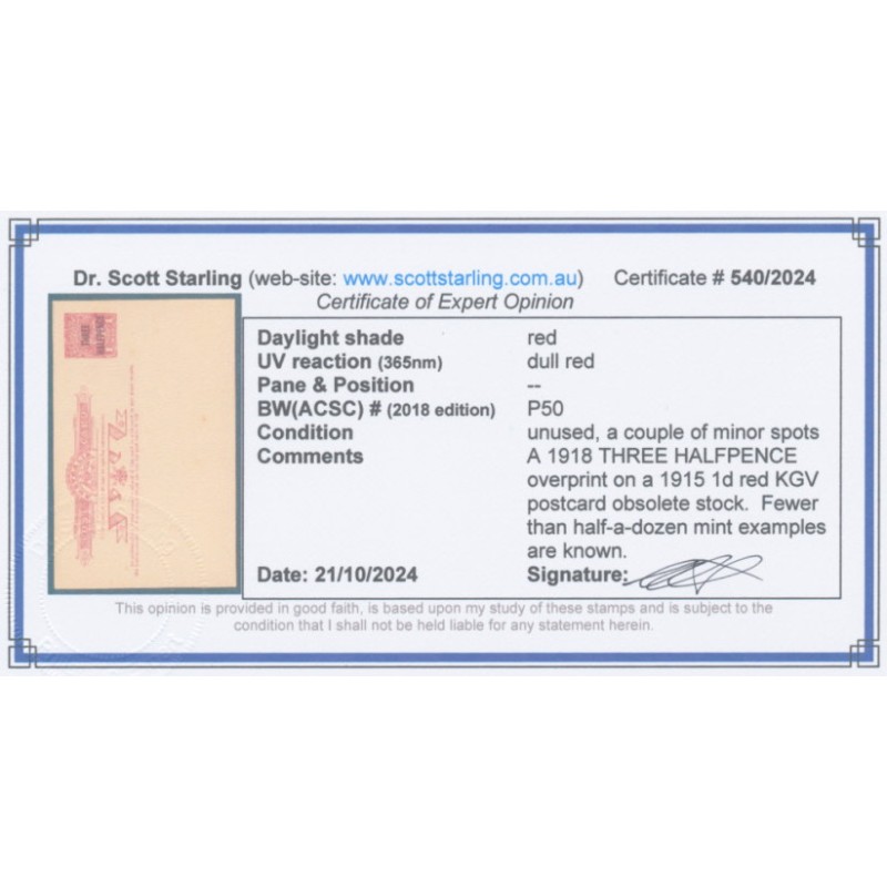 1918 1d red KGV postcard overprinted THREE HALFPENCE, unused – the card has a couple of minor spots, otherwise sound with folds or tears. A very rare piece of postal stationery, fewer than half-a-dozen mint examples have been recorded, this one is a new discovery. Has a Starling certificate.