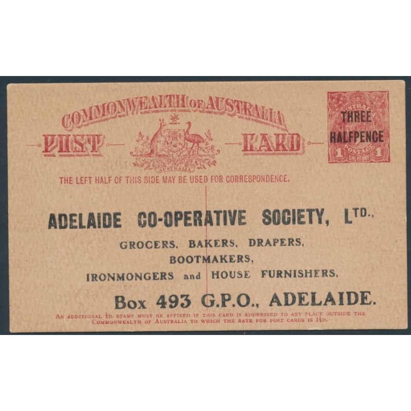 1918 THREE HALFPENCE on 1d red King George V postcard (brownish paper), with Adelaide Co-Operative Society Limited pre-printed address, unused – clean and has no faults.