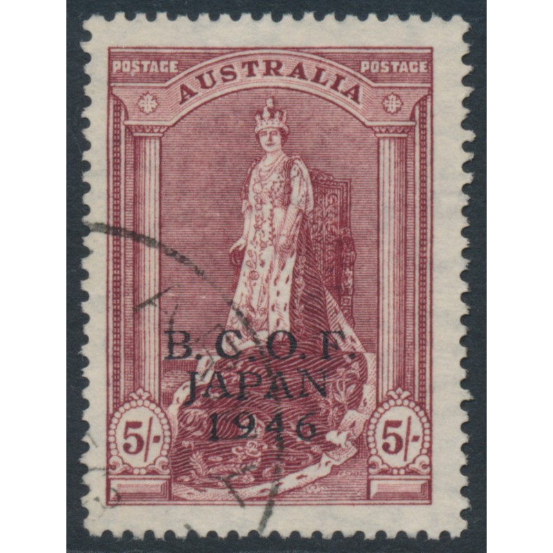 AUSTRALIA 1948 5/- claret Robes on thin paper, overprinted B.C.O.F. JAPAN 1946, used – no thins, tears or bends. BW(ACSC) Cat. # J7a SG Cat. # J7a