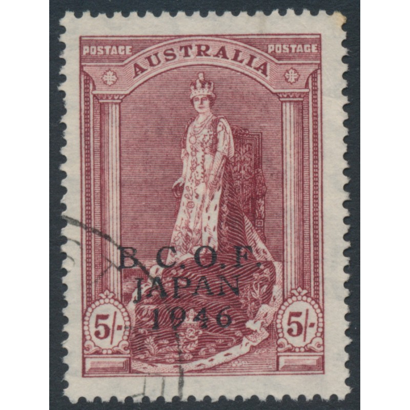 AUSTRALIA 1948 5/- claret Robes on thin paper, overprinted B.C.O.F. JAPAN 1946, used – has a couple of short perforations, otherwise sound. BW(ACSC) Cat. # J7a SG Cat. # J7a