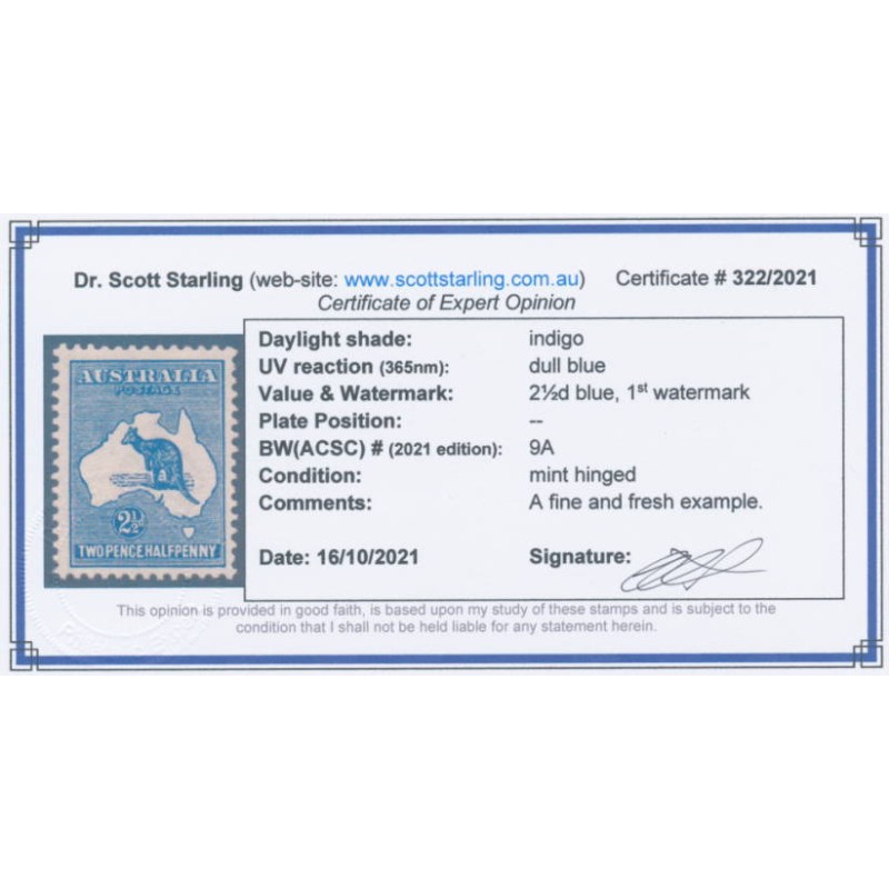 1913 2½d indigo Kangaroo, 1st watermark, mint hinged – no thins, tears or bends. Has a Starling certificate.