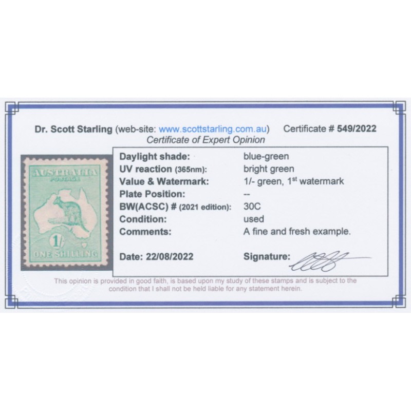 AUSTRALIA 1913 1/- blue-green Kangaroo, 1st watermark, mint hinged – no thins, tears or bends. Has a Starling certificate. BW(ACSC) Cat. # 30C SG Cat. # 11a