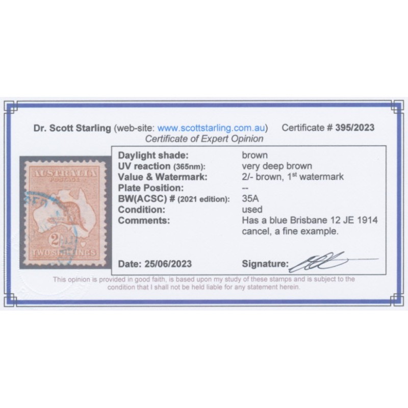 AUSTRALIA / TASMANIA 1913 2/- brown Kangaroo, 1st watermark, used – no thins, tears or bends. Has a Starling certificate. BW(ACSC) Cat. # 35A SG Cat. # 12