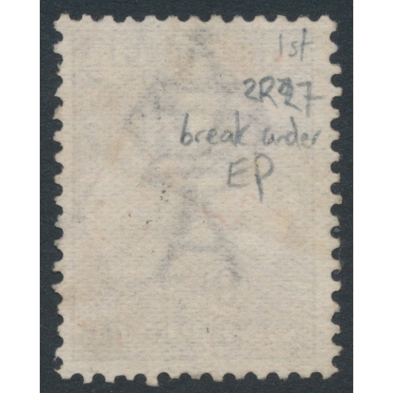 1913 9d deep violet Kangaroo, 1st watermark, plateable as 2R27 from the breaks under the word NINE PENCE, this unit would later be used as a substituted cliché in the die IIB plates, used – no thins, tears or bends. Has a Starling certificate.