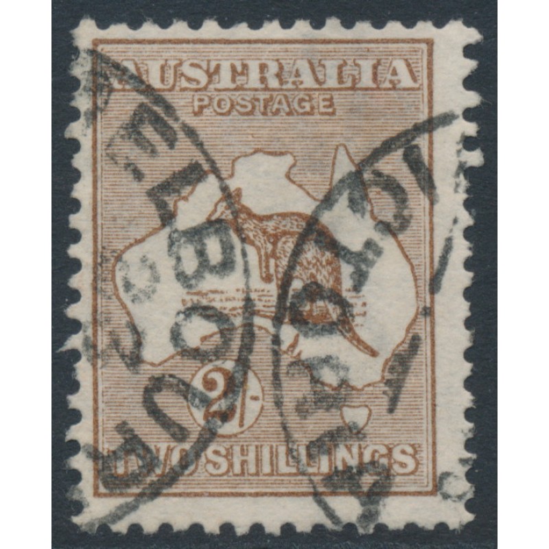 1913 2/- brown Kangaroo, 1st watermark, used – has a light corner bend.