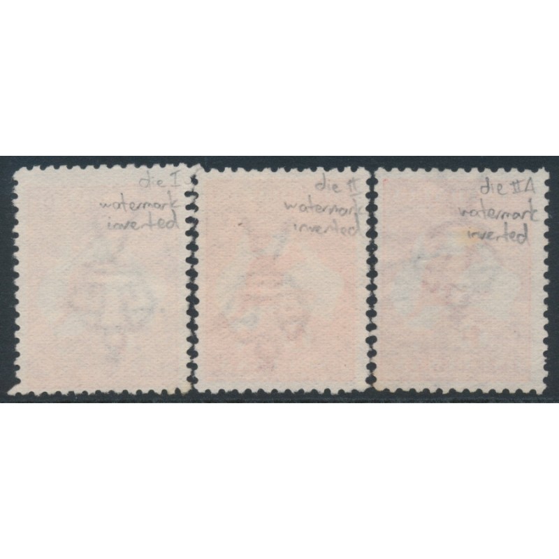 AUSTRALIA 1913-1914 1d red Kangaroos, die I, die II & die IIA, each with an inverted 1st watermark, used – no thins, tears or bends. BW(ACSC) Cat. # 2Aa + 3Aa + 4Aa SG Cat. # 2cw + 2dw + 2ew