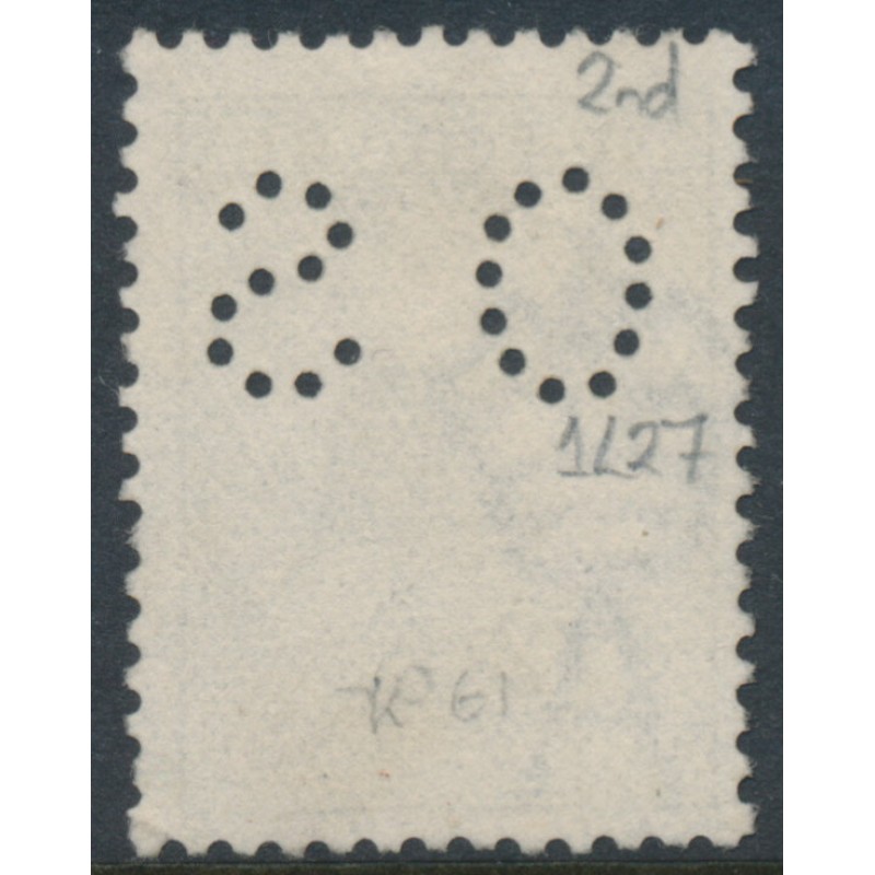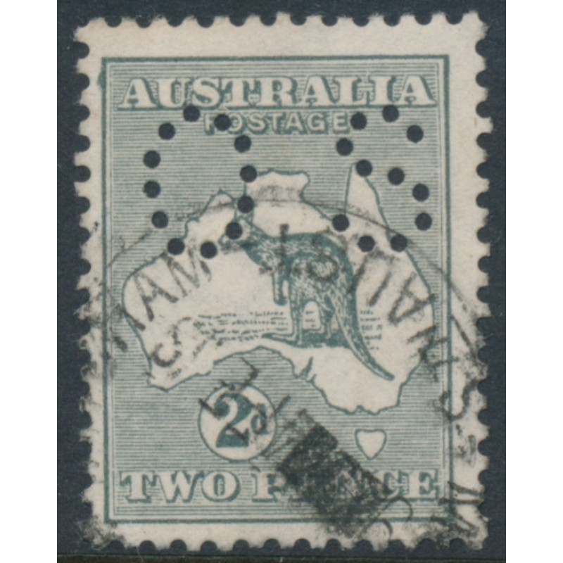 1915 2d slate-grey Kangaroo, 2nd watermark, with the variety ‘colour flaw on NW corner’ [plate position = 1L27], perforated OS, used – no thins, tears or bends. Has a Starling certificate.