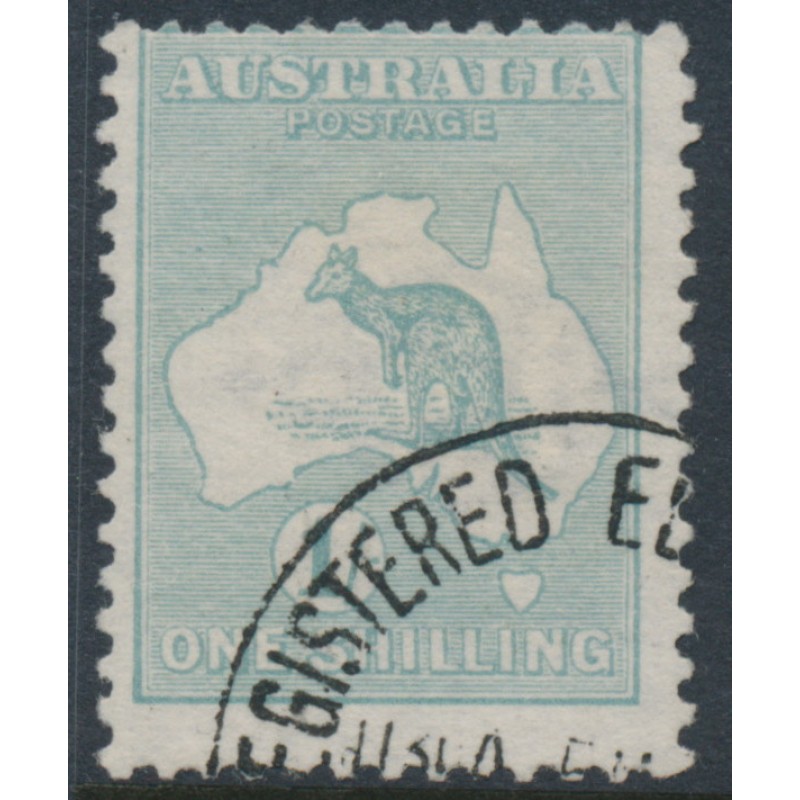 1927 1/- blue-green Kangaroo, die IIB, sideways 3rd watermark, used – no thins, tears or bends. Has a Starling certificate.