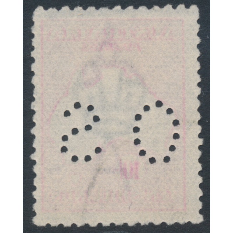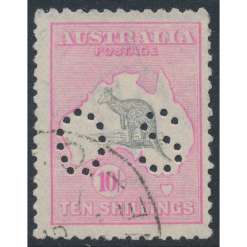 1917 10/- grey/pink Kangaroo, 3rd watermark, perforated OS, with the variety ‘break in NSW coast’ [position = L6], cancelled to order – without gum, no thins, tears or bends. Has a Starling certificate.