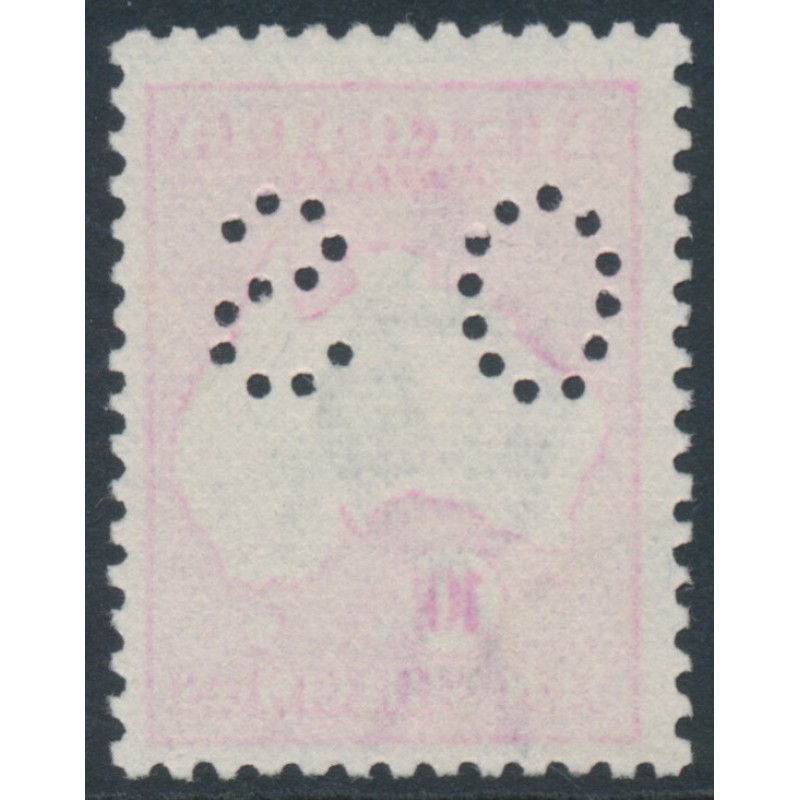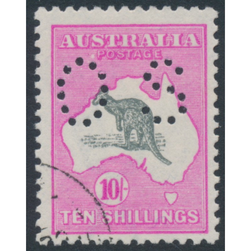 1917 10/- grey/deep aniline pink Kangaroo, 3rd watermark, perforated OS, with the variety ‘white spot before POSTAGE’ [position = R16], cancelled to order – without gum, no thins, tears or bends. Has a Starling certificate.