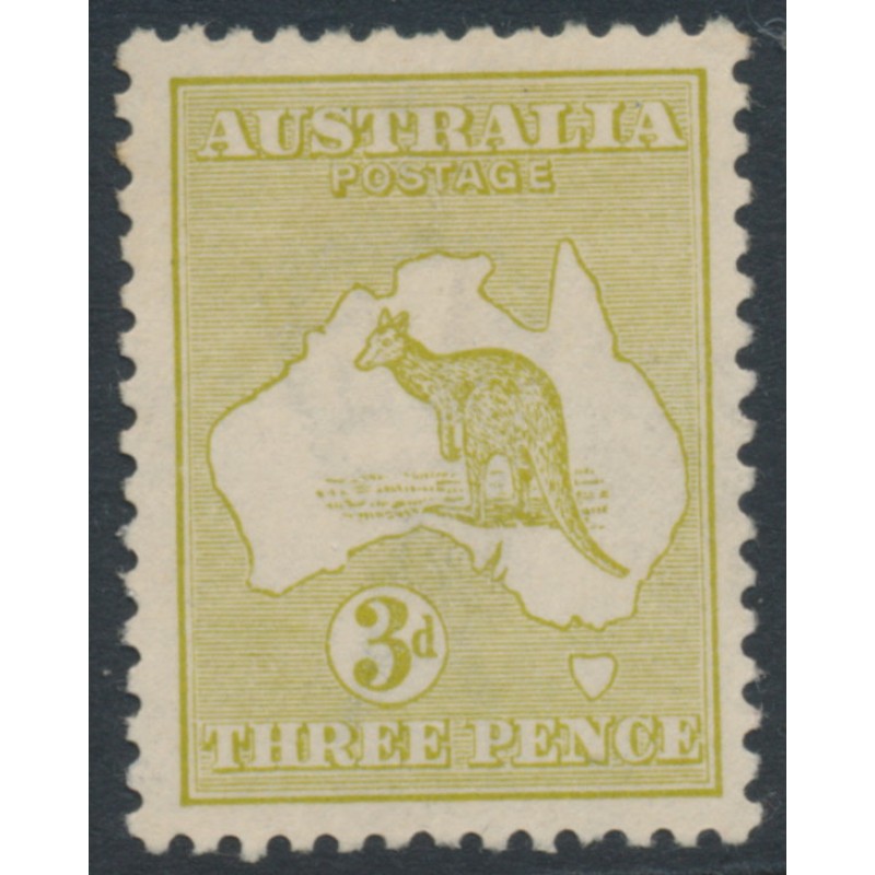 1915 3d pale olive Kangaroo, die I, 3rd watermark, mint hinged – no thins, tears or bends.