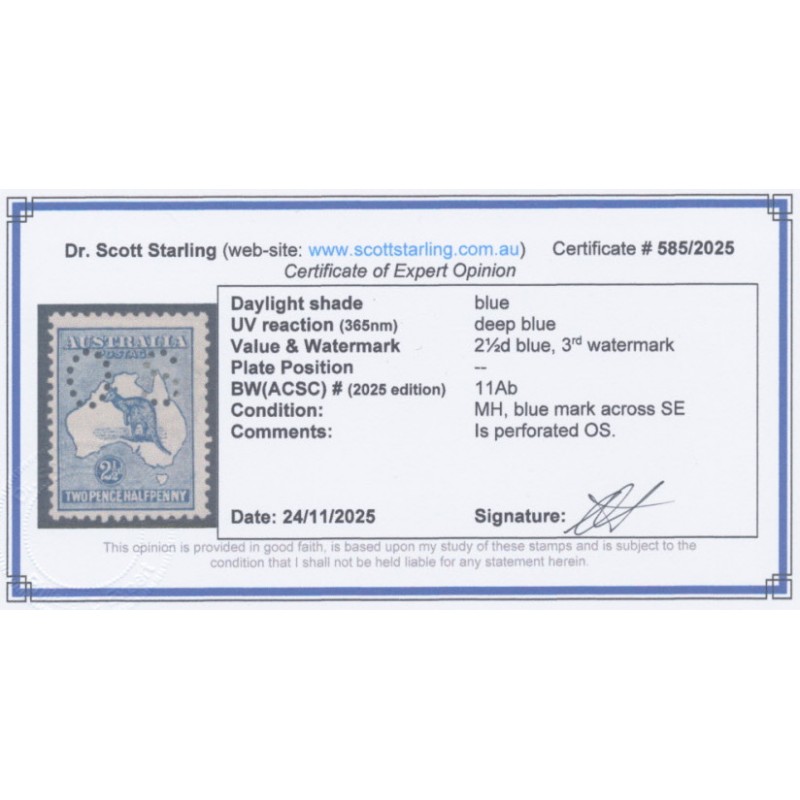 1917 2½d blue Kangaroo, die I, 3rd watermark, perforated OS, mint hinged – has a pale blue mark across the south-east corner, otherwise sound. Has a Starling certificate.
